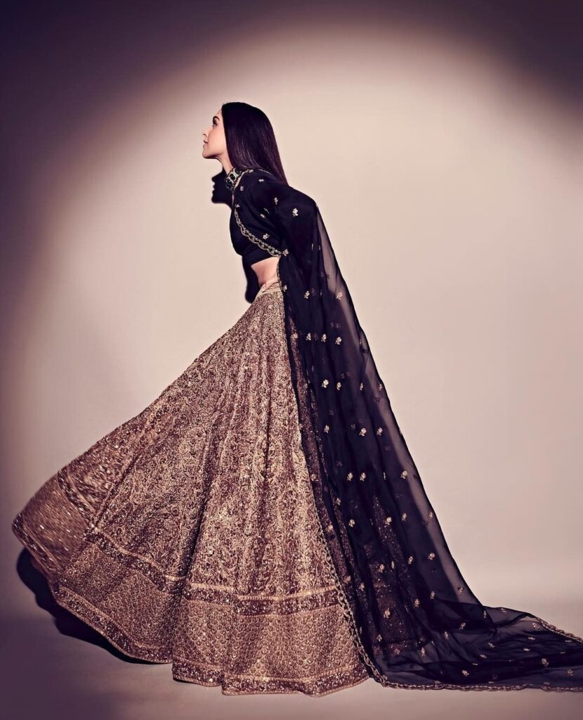 DP stunned in a glamorous gold and black Sabyasachi lehenga to Priyanka Chopra and Nick Jonas’ wedding reception in Mumbai.