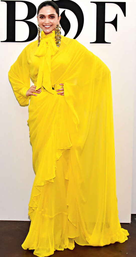 Deepika stepped out of her comfort zone was also seen in a bright yellow ruffle saree by the designer for a BOF summit. The actress completed the look with heavy studded earrings and minimalistic makeup with a sleek bun.