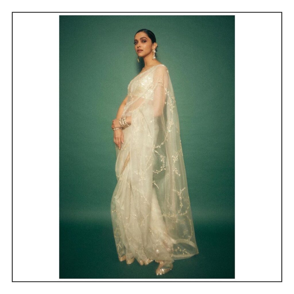 Never can we forget how beautiful Deepika looks in an all-white ensemble. The Bollywood diva looked flawless in this white see-through saree teamed with a sleeveless blouse.